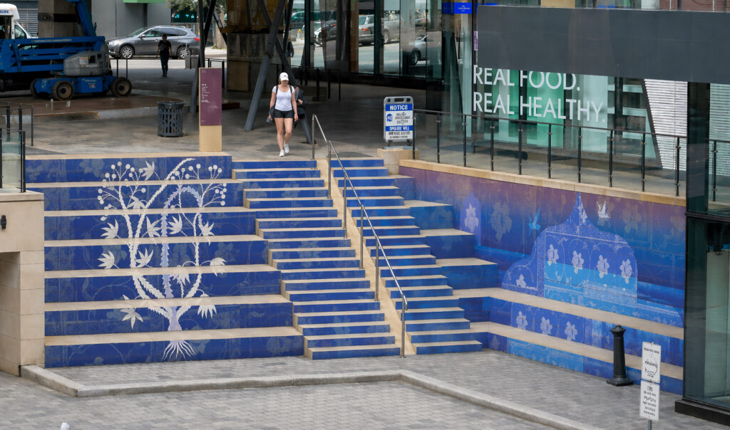 Rooted in archival Persian rug work, the inaugural Step-Up Series commission transforms the West Block staircases and courtyard into a vivid cultural tapestry, one that threads migration, memory, and everyday connection through the local architecture to welcome gathering and mark shared urban space.