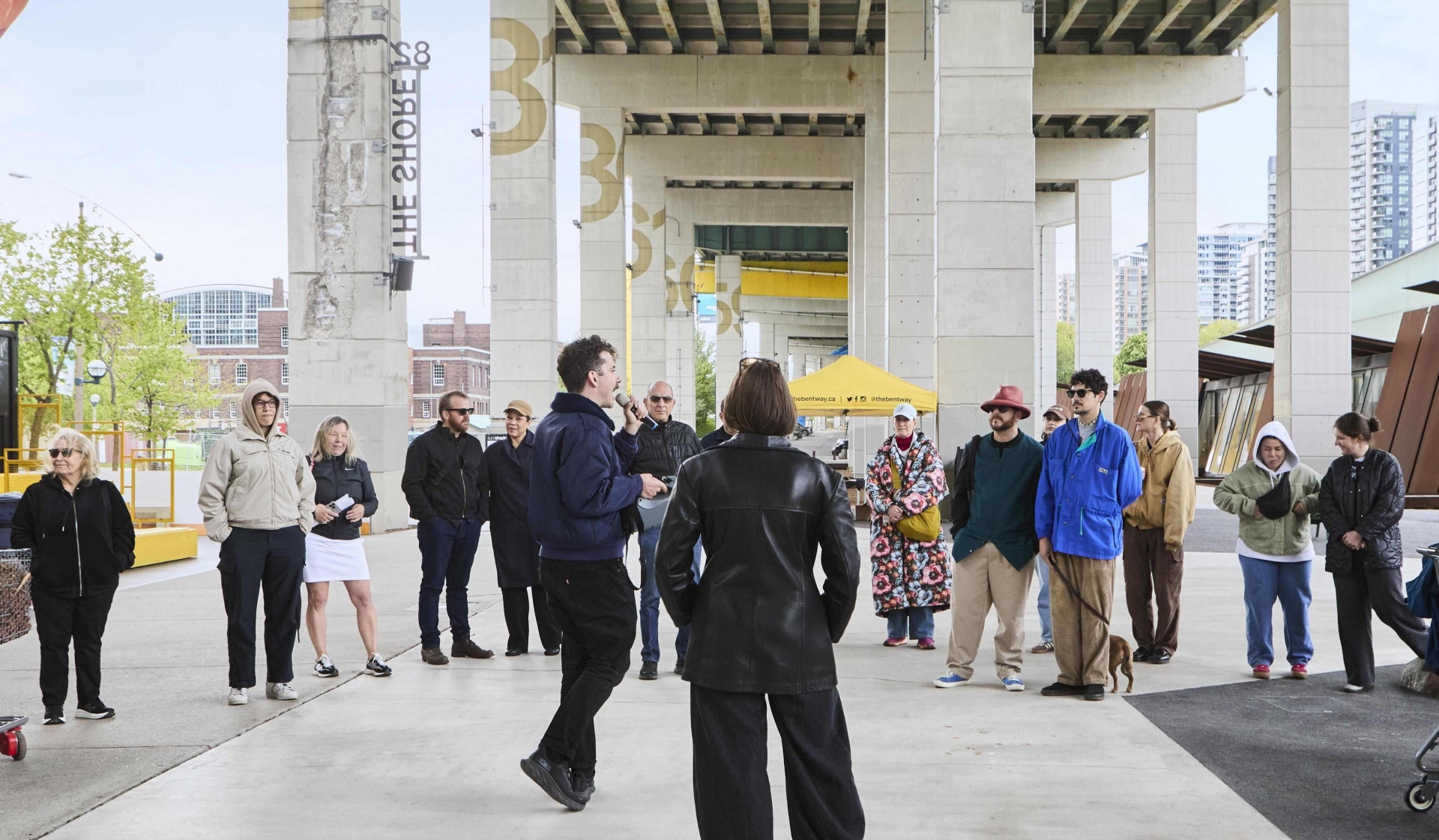 This guided experience, led by members of The Bentway team as well as the artists, invites you to gather, explore, and connect across the neighbourhood. The tour begins at The Bentway Studio (55 Fort York Blvd) before continuing on foot through CityPlace. Visitors will first arrive at a newly unveiled installation at by Stanzie Tooth at Bentway Staging Grounds (under the Gardiner at Dan Leckie Way & Lake Shore Blvd W). The artwork invites viewers to reconsider themselves not as the centre of the urban landscape, but as part of its ecological fabric, reminding us that nature is not separate from urban life but woven through it.