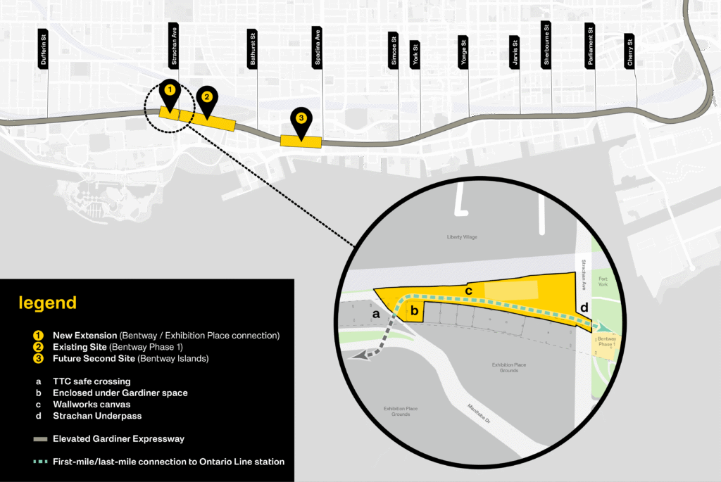 The Bentway and Exhibition Place recently revealed plans to build a connection point between our two sites, adding 50,0000 sq. ft. of new public space along the Gardiner (just west of Strachan Ave).